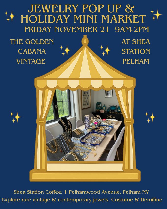 Announcing Holiday Mini Market & Jewelry Pop Up Friday November 21. The Golden Cabana Vintage at Shea Station Pelham. Explore rare vintage and contemporary jewelry, custom handbags, and Shea Station’s new in-cafe shop “Frances & Fowler,” with beautiful items for home, host and heart. An opportunity to browse for yourself, with friends, for gifts. All…