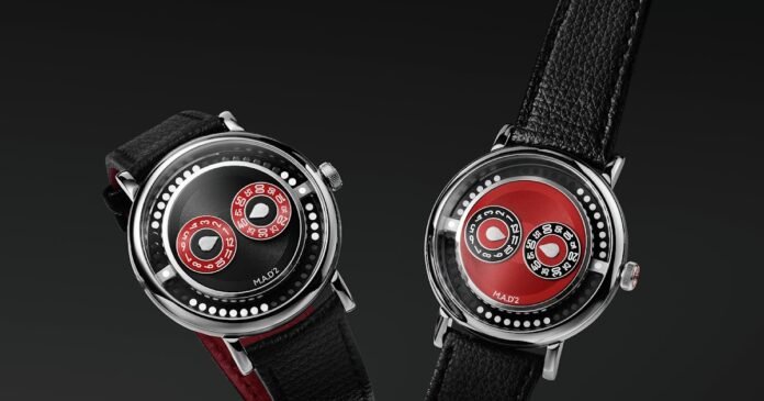 The first model, named M.A.D.2 R&B—standing for Red & Black, while also referencing the music genre—features a black dial plate paired with red jumping-hour and trailing-minute discs.