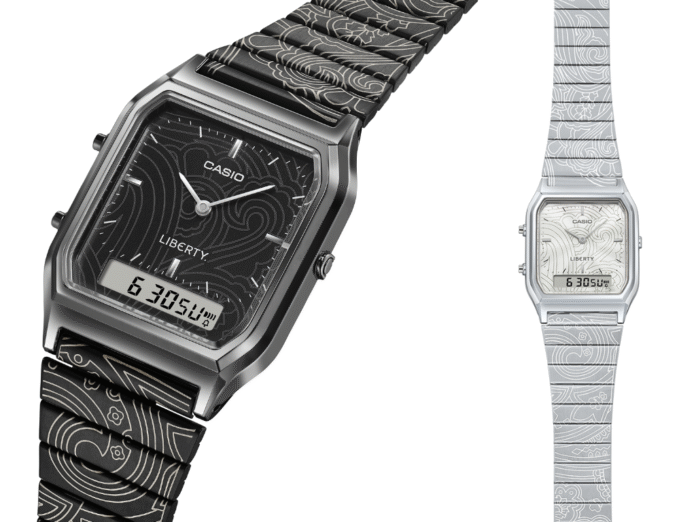 Casio and Liberty London have teamed up for a special-edition AQ-230ELT and AQ-230EBLT, featuring laser-engraved Paisley Fanfare designs on metal bands and dials. They are priced at £114.90 and £134.90 respectively, and will be available on November 20.