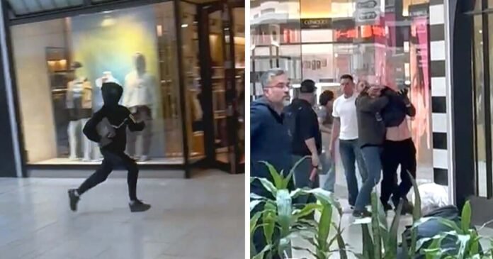 A shopper appears to subdue an alleged robbery suspect in the aftermath of a smash-and-grab robbery at a mall jewelry store in Oshawa, video shows.