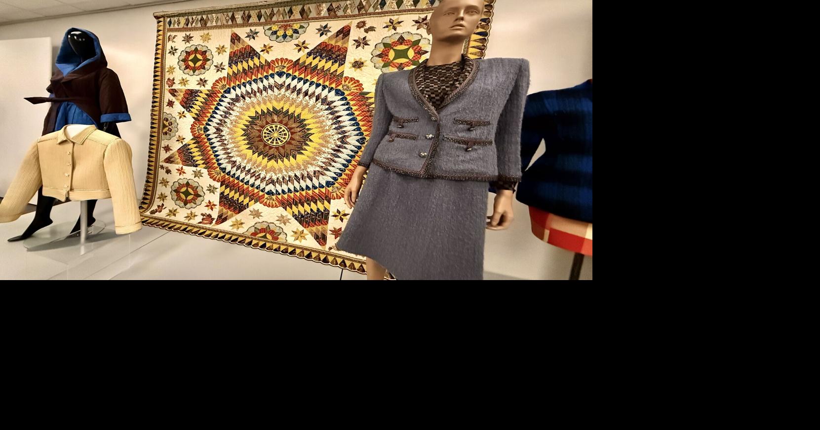 Native Louisiana fashion designer Geoffrey Beene’s designs flank a ‘Star of Bethlehem’ or ‘North Star’ quilt created in 1850 by enslaved people in the LSU Textile & Costume Museum’s exhibit,