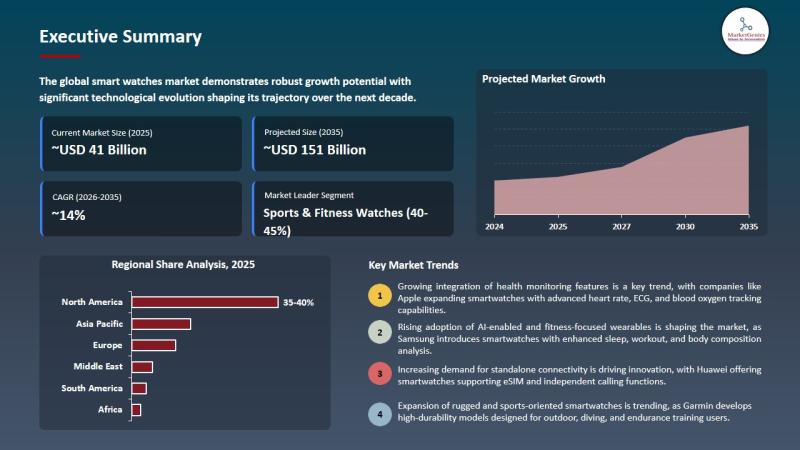 Wilmington DE USA April 24 2026 According to MarketGenics Global Research the global smart watches market is valued at USD 41 4 billion in 2025 and is projected to reach USD 150 8 billion by 2035 expanding at a CAGR …