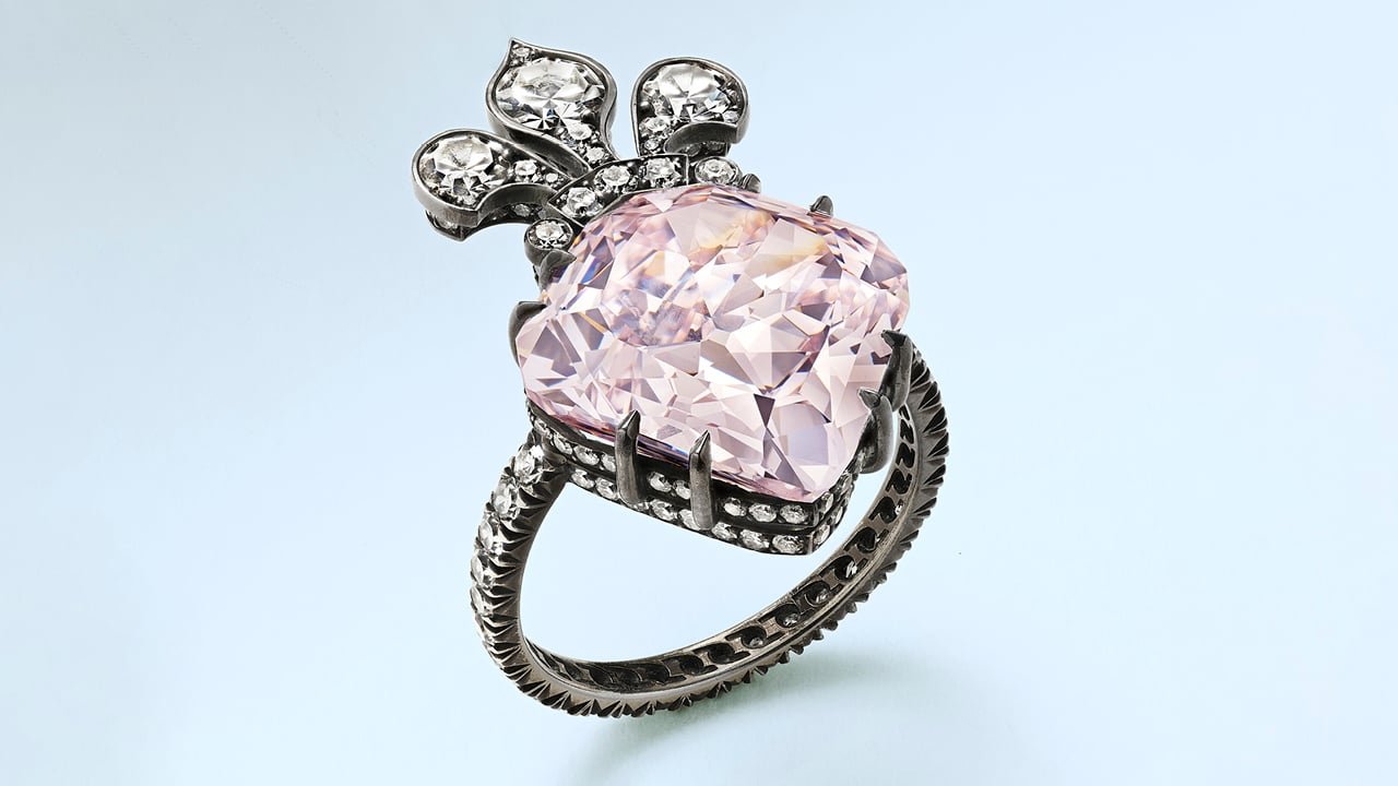 A historic pink diamond, a massive blue sapphire, and Mughal emeralds led the New York auction to a high-flying total.