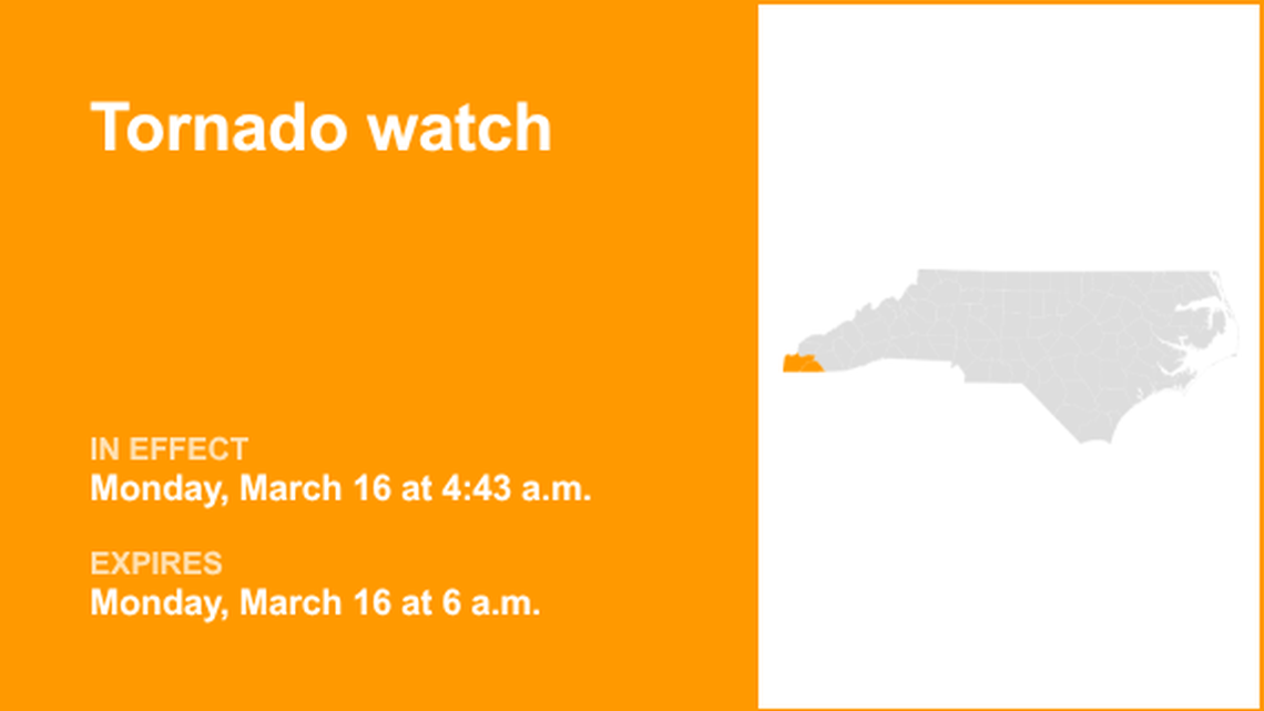 A tornado watch was issued by the NWS Morristown TN on Monday at 4:43 a.m. in effect until 6 a.m. for Cherokee and Clay counties.